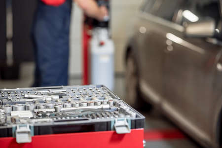 Get it renewed. Close up shot of set of adjustable metallic tools for car repair in box. Vehicle repair kit with ratchet handle and sockets. Lifted car in the background