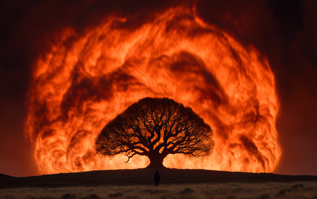 Majestic tree silhouette against fiery sky at sunset.