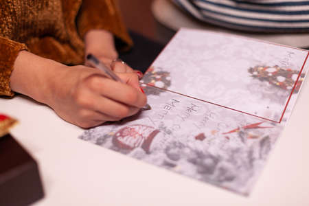 Closeup of woman hands writing xmas greeting card for family during christmas holiday standing in xmas decorated kitchen. Happy family enjoying spending winter season together