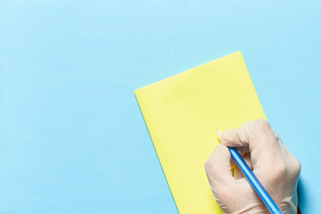 Male hand writing on a blank yellow surface with black marker. With copy space ready for your text, message or promotion.