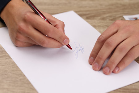 Writer signing autograph on sheet of paper at wooden table, closeup