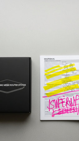 Vertical, tall 9:16 compositional shot featuring a new, complex smart home device (mesh router box)
