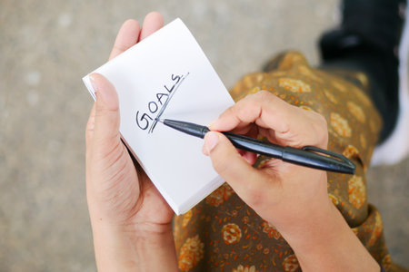 women hand writing new year goals on notepad
