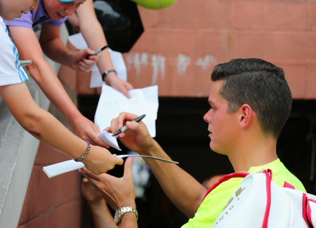NEW YORK - AUGUST 30 Professional tennis player Miols Raonic signing autographs after third round match at US Open 2014 at Billie Jean King National Tennis Center on August 30, 2014 in New York