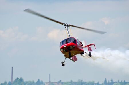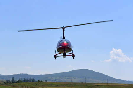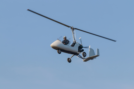 Balashikha Russia Black Airfield 22 May 2021: gyroplane Gyro Classic demonstration flight the Sky aviation festival, theory and practice.