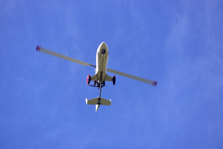 Business helicopter in the middle of the frame with clear blue sky Barcelona, Spain