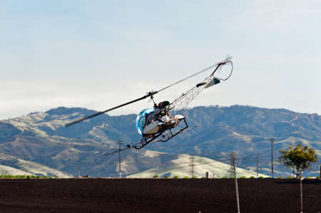 Helicopter spraying agriculture chemicals, making a turn over the field.