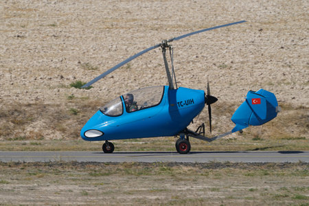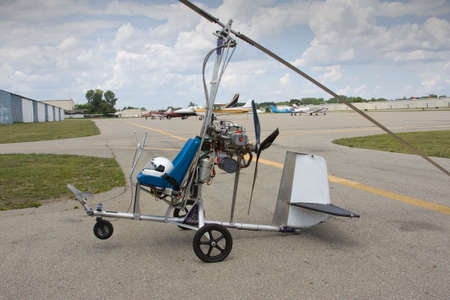 a handbuilt gyrocopter ultralight aircraft on an airfield