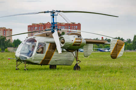Balashikha, Moscow region, Russia - May 25, 2019: Soviet multipurpose helicopter Kamov KA-26 parked on a green grass of airfield Chyornoe at the Aviation festival Sky Theory and Practice 2019