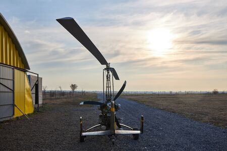 Single place ultralight homemade gyroplane stands at the airport near the hangar in the early morning
