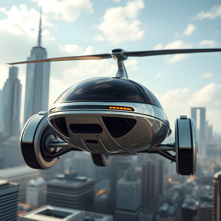 A sleek, futuristic flying car soaring above a modern science fiction cityscape, showcasing advanced transportation and urban innovation.