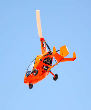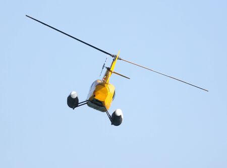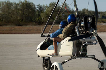 White small double gyroplane autogyro without a cabin against the blue sky. Air tours for tourists. Mini helicopter