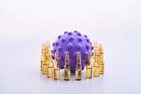 Copy space transparent medical ampoules in a row. Children's colored toys in the form of viruses. Medical ampoules protect against the virus. Isolated