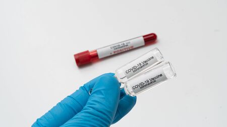 A hand in a medical glove holds an ampoule with a vaccine against the coronavirus infection COVID-19 on a white background. Vaccine. Ampoule with medicine. Doctor holds an injection drug in his hand.