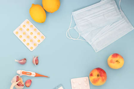 Hospital masks on a blue background. Medicines and fruits lie