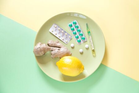 Mix of treatment on two color background. Some pills and a lemon on the plate. Green and yellow colors.