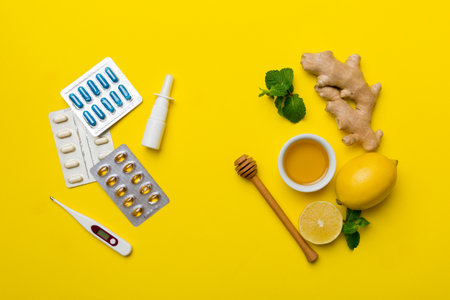 Natural cold and flu home remedies. Natural ingredients for immunity stimulation and viruses protection. top view flat lay.