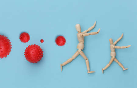 Puppets runs away from the molecules of the virus strain on a blue background.
