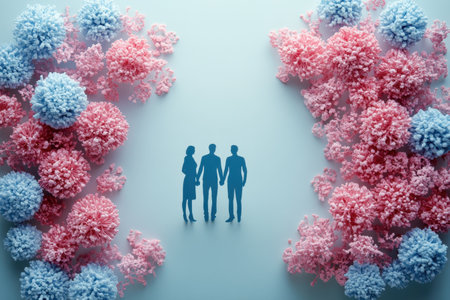 Two silhouettes holding hands with a woman nearby, framed by vibrant blue and pink floral shapes.
