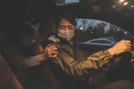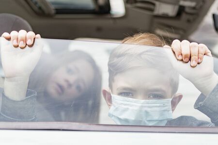 Boy and girl driving a car wearing sterile medical mask. Taxi driver with a passanger stuck in a traffic jam during coronavirus quarantine isolation in the city. Prevernt spread of covid-19 concept