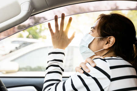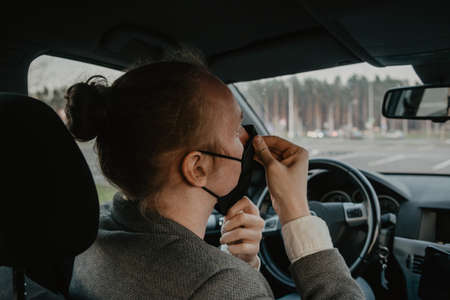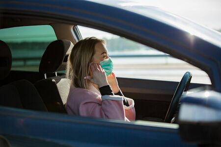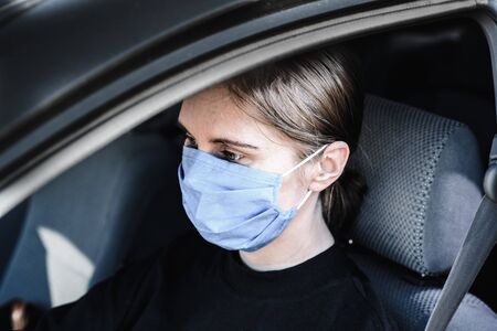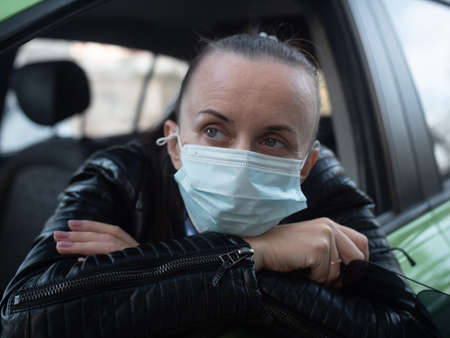 woman driver in a medical mask sits in the car in front of and looks out the window. Quarantined security.