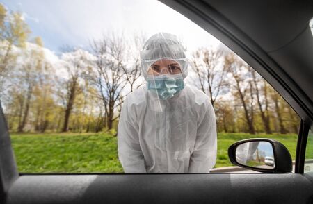 Woman in protective mask sitting in car and talking with medical worker in virus protective suit