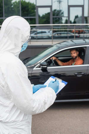 Sad driver standing near medical worker in hazmat suit writing on clipboard
