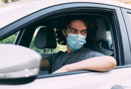 Young teenage driver with protective surgical mask and gloves sitting in a car, corona virus protected person