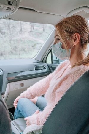 A young passenger woman wearing a respiratory protective face mask looks at the landscape in the back of a vehicle during a travel. Concept of