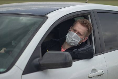 Man driving a car wearing on a medical mask during an epidemic, a driver in a mask, protection from the virus. Transport isolation.