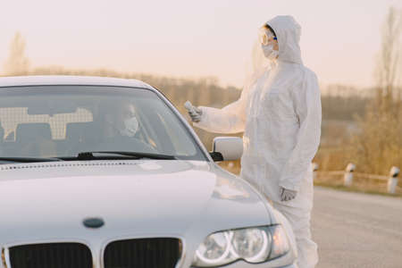 Man in protective suit, medical mask and rubber gloves for protect from bacteria and virus is planning to drive. Protective mask while quarantine, world pandemic, covid 19, coronavirus, infection.