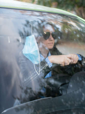 Portrait of a Caucasian woman sitting in a car and wearing a face mask against covid 19 and a blue shirt on a sunny day, looking at camera