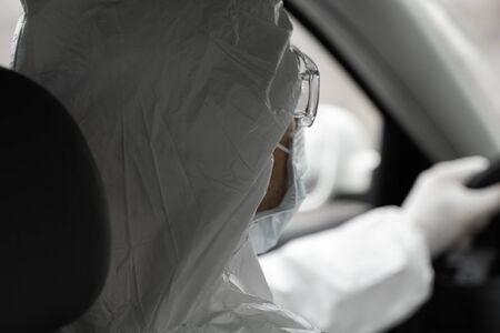 Man in protective suit, medical mask and rubber gloves for protect from bacteria and virus is driving a car. Protective mask while quarantine, world pandemic, covid 19, coronavirus, infection.
