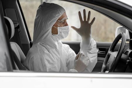 Man in protective suit, medical mask and rubber gloves for protect from bacteria and virus is driving a car. Protective mask while quarantine, world pandemic, covid 19, coronavirus, infection
