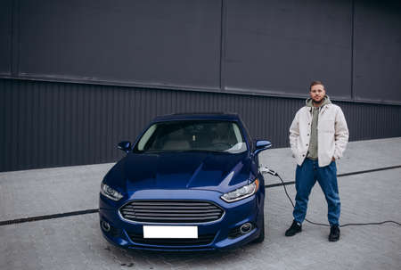 The guy sat down on the hood of the car. His car is charging at the charging station. A man looks at the smartphone screen and smiles.