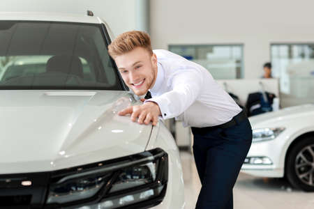 Smiling confident bearded businessman wearing business suit sitting behind wheel of new car in auto dealership, view from window. Concept of choosing and buying new car at showroom