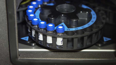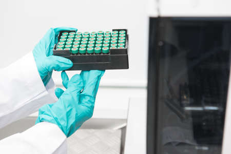 Close up woman hand in a rubber gloves put sample in a glass vial with blue cap into the autosampler rack in HPLC system. High performance liquid chromatography for separation compounds . Scientific and research work at chemical or clinical laboratory