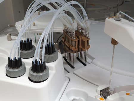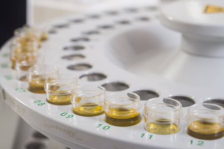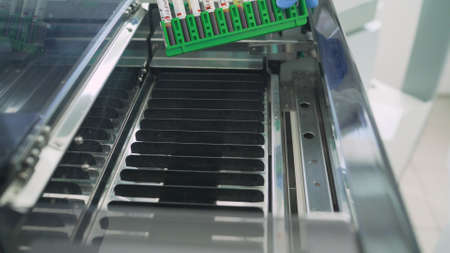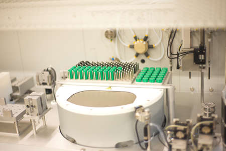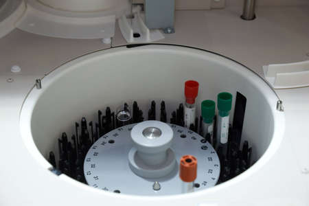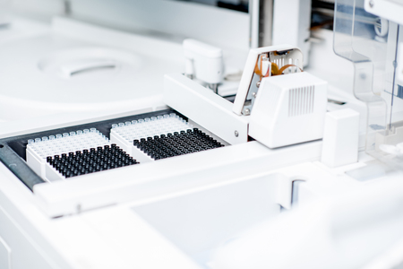 Close-up view on the sample tubes of the medical analyzer in the laboratory