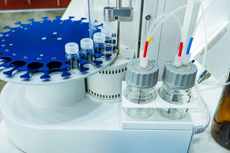 Automatic titrator. Laboratory centrifuge close-up. Laboratory titration device. Automatic titrator with flasks. Laboratory analytical equipment. Lab analyzer close-up. Medical equipment