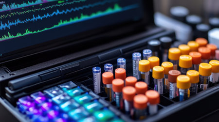 A close-up view of advanced laboratory equipment with colorful backlighting, emphasizing technological innovation in a modern research facility dedicated to scientific analysis and medical diagnostics.
