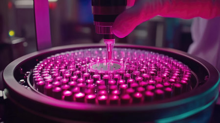 A close-up view of a laboratory technician using a precision pipette to transfer liquid into glass vials, illuminated by vibrant pink lighting that enhances the high-tech atmosphere.