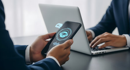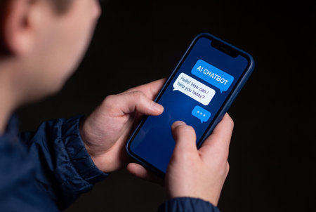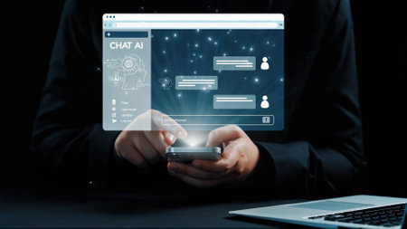 A person interacts with a smartphone featuring an artificial intelligence chat interface, visually representing modern communication in a digital workspace.
