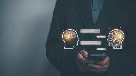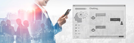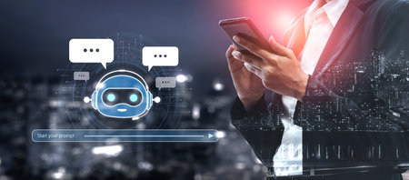 Chat ai concept. Businessman chats with AI on a smartphone. Chatting with a smart artificial intelligence, a customer chatbot service application, using command prompt to generate outputs.