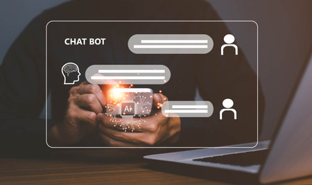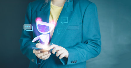Chatbot,AI Artificial Intelligence. Man chatting with digital assistant bot on mobilephone,digital communication technology. Future of business smart app service, online messaging, innovation network.
