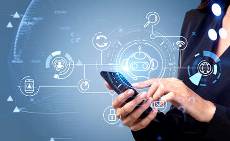 Human holding smartphone with Chat Bot application for online information. Artificial Intelligence concept