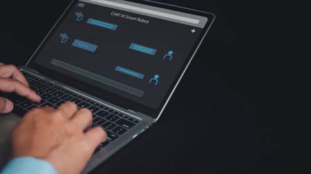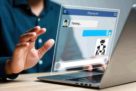 A modern depiction of AI technology showcasing a digital chatbot interface interacting with a human on a laptop.