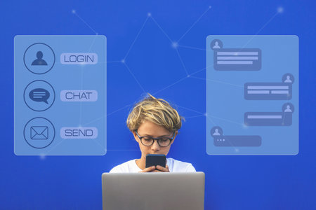 Teen chat concept. Communication with smartphone and computer. Adolescent online internet contact