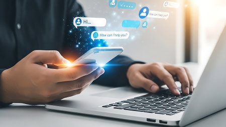 Business online communication. Man using chatbot on phone with laptop blurred in background. Social media digital network connecting people. Customer support assistant service.