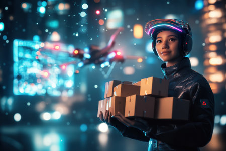 Futuristic post office with humanoid robot managing counter and interacting with holographic projection of customer sending and receiving packages