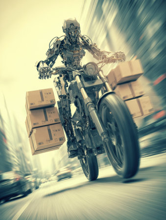 A humanoid robot rides a red motorcycle on a road with delivery boxes attached.